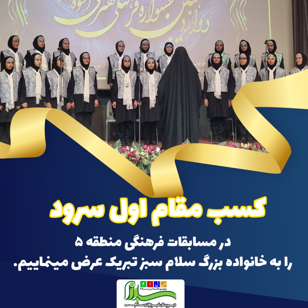 کسب مقام اول گروه سرود در مسابقات فرهنگی منطقه 5 را به خانواده بزرگ سلام سبز تبریک عرض می نماییم.